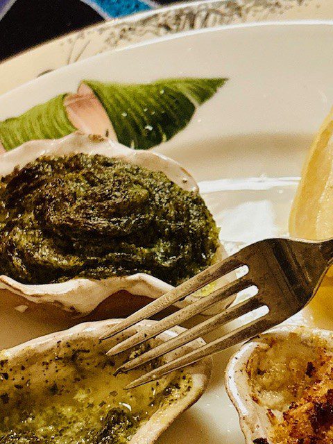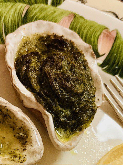 Start by making a blonde roux. Melt 1/2 stick of butter (1/4 cup) in a big Dutch oven and add the minced white onions and garlic. Stir. Add the 1/4 flour. It will almost immediately become a thick paste. Add the greens: 2 bunches of parsley (cut off the stems and roughly chop the rest); 1/4 bulb of fennel, sliced very thin; chives (1/3 of a pack of chives, the kind you buy in the produce-herb section of the grocery store), fresh tarragon (about 8 sprigs); six scallions chopped; celery with leaves (two stalks). Cook over low heat until you have a mush of greens. The mixture may get too dry — add about 1 TBS. of oyster juice. Add another 1/4 cup of butter (another 1/2 stick) gradually. Keep stirring so that the mixture doesn’t stick to the pot. COOK FOR ABOUT AN HOUR OVER LOW HEAT. But, save a little bit of softened butter for when you start processing the greens. You’ll need one whole stick of butter to two bunches of parsley. Season with salt. Season with lemon juice (you will wind up adding about 3 generous squeezes of lemon or the juice of about 3/4 lemon). Add the 1 TBS. of Pernod. Add 1 heaping TBS. of shredded cheese (since I can no longer stand the taste of parmesan I use a very strong white cheddar, e.g., Sartori in the black package). Add about 4 TBS. bread crumbs (stale French bread or one of those rustic baguettes from Fresh Market pulverized into very fine crumbs). Let this mixture cool! Then puree it — I started the puree in the food processor, adding the last TBS. or so of softened butter, and then relocated the mixture to a bowl and used my immersion blender. When you have a smooth puree, put it in a piping back with a big star tip (the pink Wilton tip) and pipe the topping onto the oysters. Now, for the oysters: I bought a pint of oysters at Dorignac’s and placed one big one in each ceramic oyster shell. (If you have shuck raw oysters and use the real shells, then more power to you!) BROIL AT 550 DEGREES FOR 12 MINUTES. But check on them before 12 minutes go by! In my old oven, I broiled them for 8 minutes, but in my new oven, it’s 12 minutes. Go figure. Broilers scare me because they can burn your beautiful food in no time! But, you’ve got to broil these oysters because if you try to bake them, the butter will melt and you’ll get kind of an oily topping (as opposed to the little crispy-crustiness on top and the smooth unctuous filling beneath). You might want to squeeze a drop or two of lemon juice on top and serve. This recipe makes 9 oysters for me. But I tend to pile on a lot of the puree so I could probably get 12 oysters out of this recipe if I were more judicious with the topping.