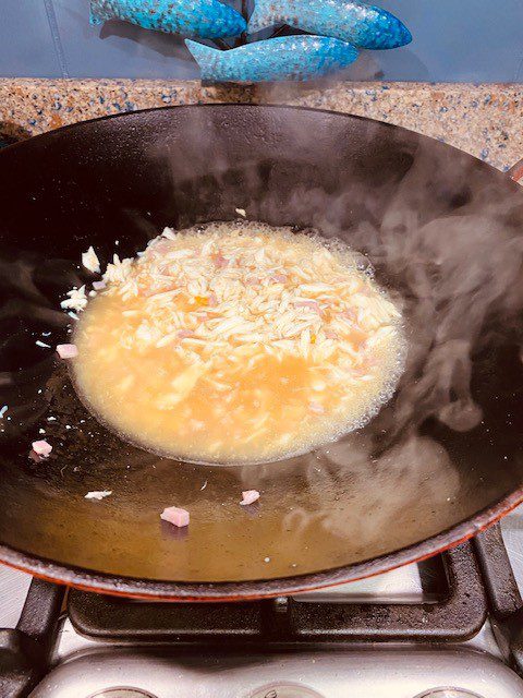 There should be a little flavored oil in the bottom of the hot wok. Add the wine and then add the chicken stock.