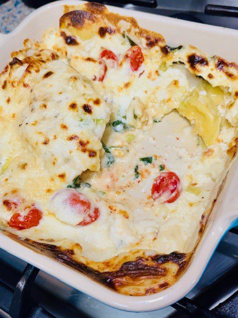 Assemble the casserole. Put the spinach leaves on the bottom. If you are using the filled pasta, make a layer of that over the spinach. Then place the sea bass on top of the spinach and pasta. Sprinkle the cherry tomatoes (which you have sliced in half and salted) all around the fish. Toss on some chopped scallions.