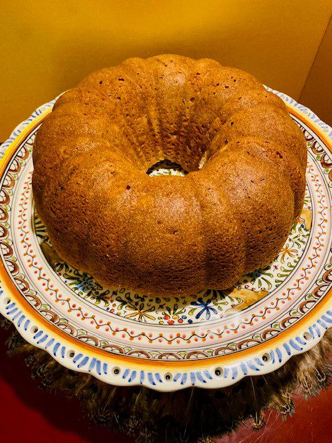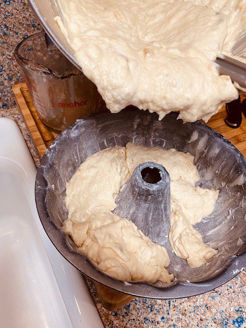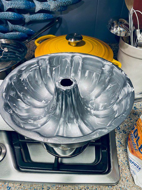 Prepare a Bundt pan by coating the non-stick surface with Crisco. Then sprinkle/pour flour all over the interior of the pan, rotate it, and tap out the excess. Pre-heat the oven to 325 degrees and position the rack so that you will be baking your cake in the lower third of the oven.