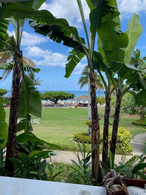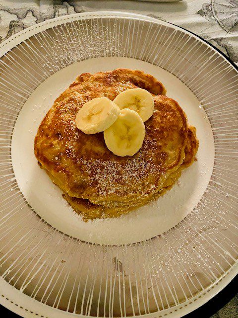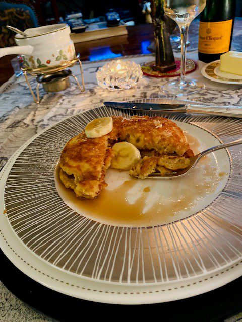 My goal in life is to stay in every room at the Jamaica Inn. All of them are special. The Cowdray Suite has a wonderful balcony while Room 26 is prime real estate half-way between the restaurant and the spa. Of course, the White Suite has the most coveted location and lineage having been one of Winston Churchill’s favorite places to paint. Breakfast in any of these spots is gracious, relaxing and delicious. But these banana pancakes reminded me mostly of the Blue Cottage… right on the beach, steps from the ocean… emphasis on privacy with a view of the sand, sea and palm trees that is guaranteed to soothe your frazzled soul. Breakfast in Ocho Rios is a promising start to the rest of a restorative day. Think of these pancakes as a vacation you can take without leaving the house. They’re wonderfully indulgent for dinner with a glass of champagne.