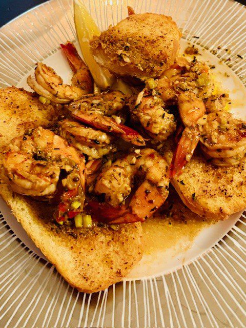 I CHEATED. I USED THE SEASONING FOR BBQ SHRIMP BELOW. IT WAS SPICY AND DELICIOUS. JUST FOLLOW THE DIRECTIONS AND YOU CAN’T GO WRONG. I DID ADD FRESH SCALLIONS AND FRESH MINCED GARLIC, WINE AND A SQUEEZE OF LEMON JUICE. THE SHRIMP WERE ABSOLUTELY DECADENT, SWIMMING IN SPICY BUTTER! THIS IS NOT GOING TO HELP YOUR CHOLESTEROL LEVEL BUT IT WILL DEFINITELY IMPROVE YOUR ATTITUDE.