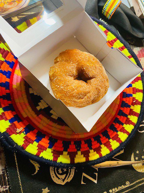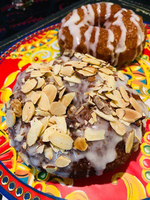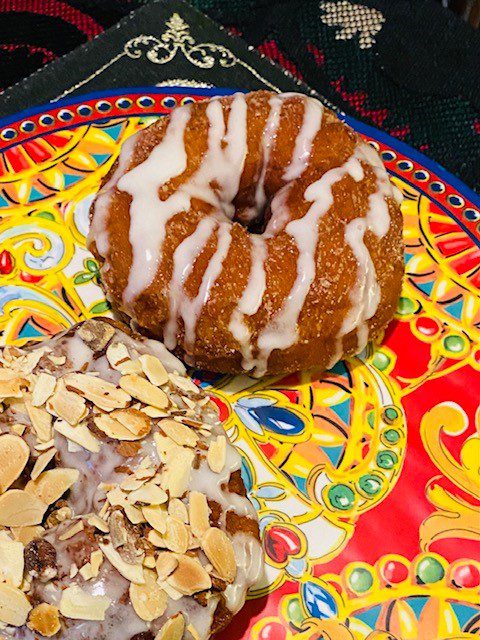 If you want to glaze the doughnuts with icing, mix one cup sifted confectioner's sugar with 2 TBS. milk and 1 teaspoon vanilla extract. You can then sprinkle nuts over the top of the doughnuts; in this case, I had a packet of mixed nuts from Starbuck's, and they were perfect on top of an iced doughnut.
