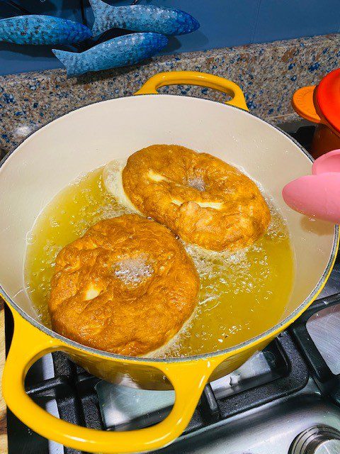 Heat Canola oil to 365 degrees and fry the doughnuts, flipping after 90 seconds. Don't crowd the doughnuts in the pot.