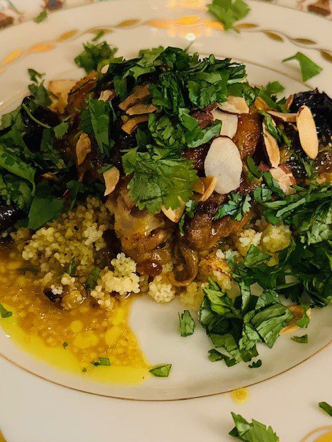 And I have to say that the couscous I served with this chicken almost became the star of the dish. In fact, if you can’t find couscous at the grocery store, order it from Amazon: https://amzn.to/46dbkhn Based on a tip from the cashier at Dorignac’s, I made the couscous in my rice cooker, adding a healthy squirt of lemon juice and golden raisins. Wow, it was terrific. I wound up scooping rice, chicken, raisins and prunes with a chunk of Dorignac’s beautiful Italian bread, and it was fantastic. While cooking at 415 degrees for one hour, this casserole filled my house with a homey, warm, cinnamon-y smell that evoked the holidays. Perfect on a cool, drizzly, foggy Friday night while screening Casablanca (again). My tips for making this dish are: (1) slice the onions on a mandolin as thin as you can, so that they are almost shaved, but don’t shave off the tip of your finger like I did a few years ago; (2) pour the wine around the chicken, not on it; (3) after you dust the thighs with spices, let them sit for at least half an hour, or let them marinate in the fridge for a while and then allow them to return to slightly colder than room temperature before cooking; (4) for the couscous, toast those almond slivers at 415 degrees for about five to seven minutes, watching them carefully so that they don’t burn, and (5) serve with a luscious and juicy white wine like an Alsatian Hugel Pinot Blanc.