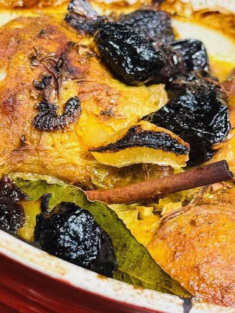 I named this dish Casablanca chicken because Casablanca is the largest city in Morocco, and of course because Casablanca is one of the best movies EVER. This recipe is actually inspired by several Moroccan chicken dishes I found posted online. I especially liked the Chicken and Prunes dish on Giangi’s Kitchen website. Although that recipe calls for the chicken thighs to be browned in the bottom of a tagine and then braised, I opted to bake the thighs in a casserole surrounded by thinly sliced (almost shaved) onions and spices and prunes. I also added some brown sugar to Giangi’s recipe and to my taste buds it was an improvement.