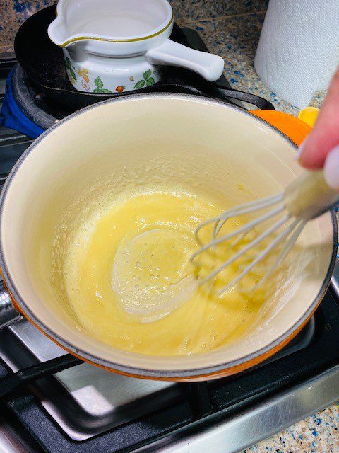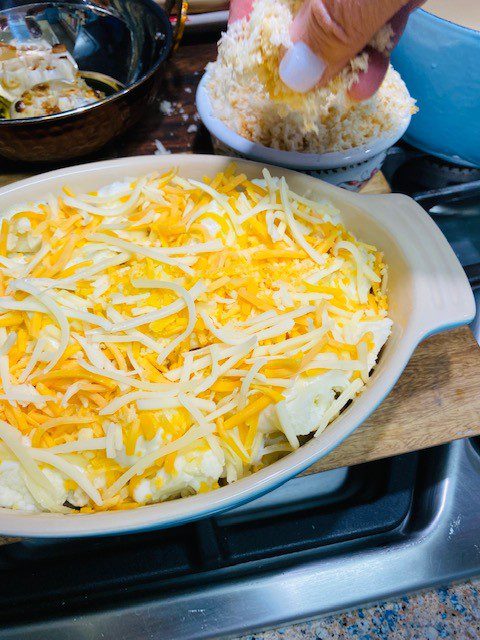 Steam the cauliflower for about 10 minutes or until fork tender. I used a steamer basket over 2 inches of water in a Le Crueset stew pot. Put the vegetables in the steamer basket and lower into the pot. Bring the water up to temp over a medium high heat. When you see steam rising from the pot, cover it and cook until the cauliflower until tender but still just firm. You want a vegetable that is not mushy but also not entirely crunchy. Remember it will continue to cook in the casserole.