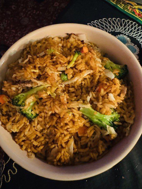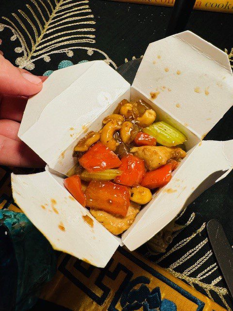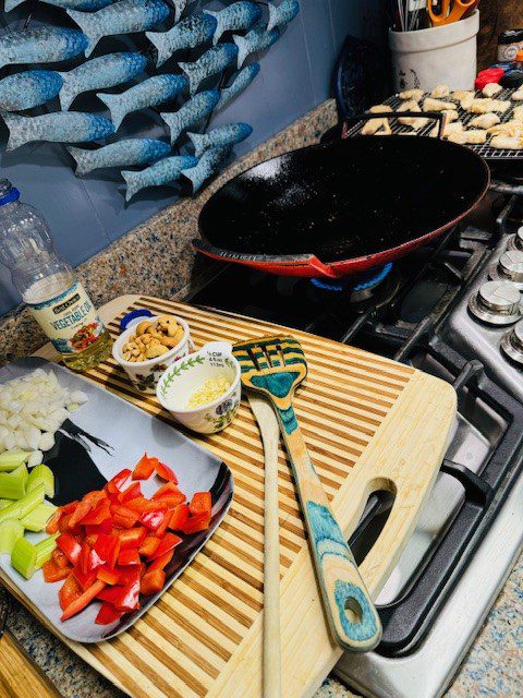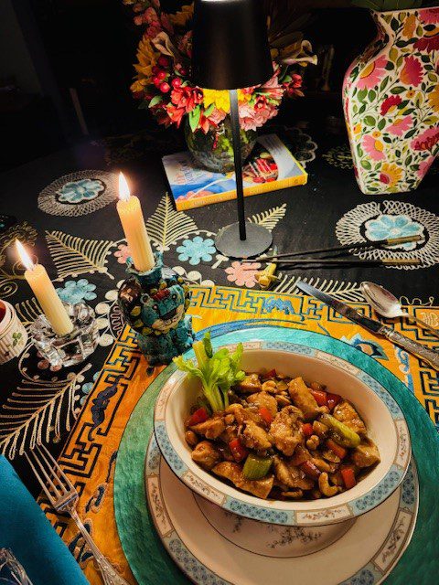I love a stir fry. First, you do your mise en place. Then, velvet your protein. Next, chop your vegetables. And make your sauce. Then, go do what you want to do. Start the movie, open the wine, spend quality time with your dogs. When you are ready, fire up that gorgeous Le Creuset wok that is so well seasoned it has become completely ‘non-stick.’ Just don’t take a call from your mother once you start the stir-fry (you can call her back later). This recipe is from Nagi Maehashi’s cookbook DINNER (2023). I used chicken breasts instead of thighs, and velveted the chicken according to the instructions on the Woks of Life website. I wound up with the most wonderful tender chunks of chicken stir-fried with crispy celery, red bell pepper and cashews coated in a delicious better-than-take-out sauce. Technique is everything here. As for the vegetable fried rice, I picked that up at my neighborhood Hot Wok take-out only restaurant. I’m not sure I can out-do Hot Wok for vegetable fried rice and it rounded out a perfect Saturday night dinner.
