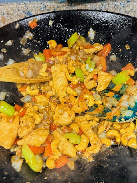 When the chicken is cooked through, add the sauce. Let the sauce bubble up and thicken. Then add the cornstarch slurry and give everything a few good stirs. Add the cashews last and heat through. You're ready to serve!