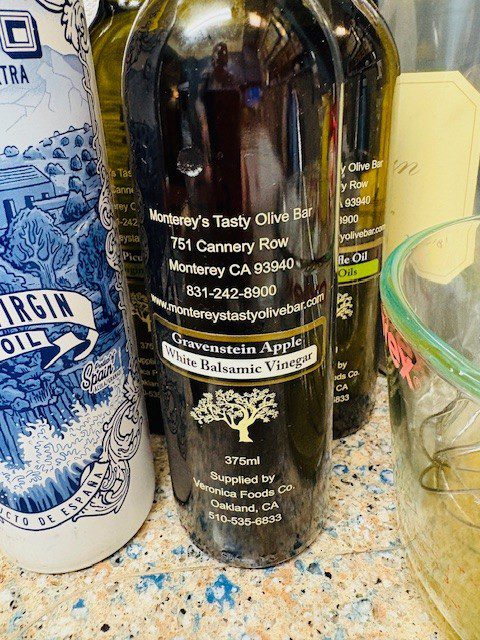 I found these Balsamic “pearls” at Dorignac’s and they were delicious on top of this salad. This combination of candied pecans, rotisserie chicken and blue cheese really works! Of course, you can add and subtract whatever components appeal to your taste buds. The apple vinaigrette is delicious. Once again, I am plugging Monterey’s Tasty Olive Bar! I guess I am just going to have to plan a trip to Carmel and make a pilgrimage to this wonderful little store.