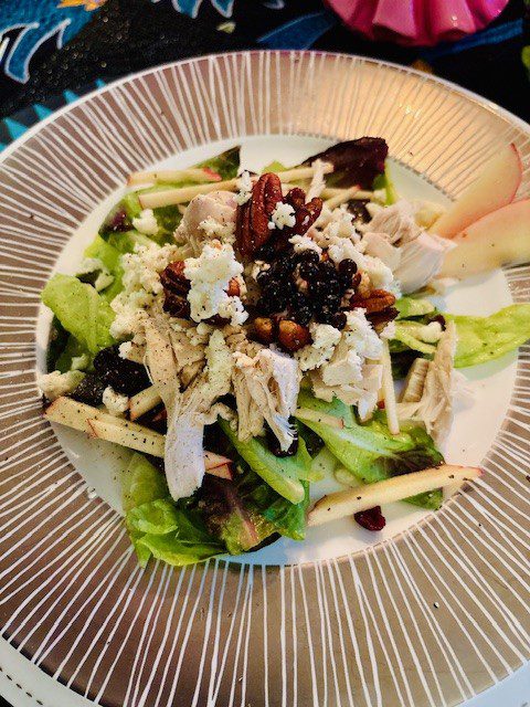 Make the salad: Mix the greens with the vinaigrette. Pile it on a serving plate. Arrange the apples, cranberries, chicken, pecans, etc. on the salad. The sprinkle of blue cheese goes last. The balsamic pearls go on top if you are using them.