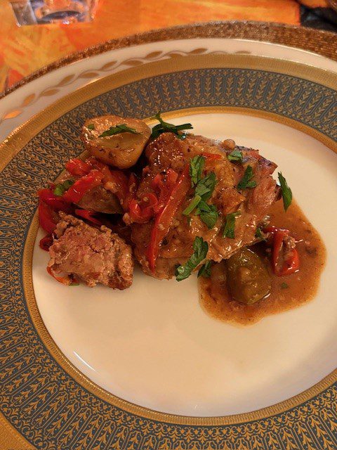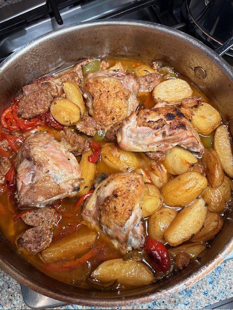 This is an Italian-American dish that originated in the regions of Campania and Sicily.  Translated, the name means, “shoemaker’s chicken,” but I can’t tell you why the Italian shoemakers became associated with this hearty casserole.  In researching various recipes, the common elements were chicken, sausage and cherry peppers.  Other than that, there was a wide variation in technique and ingredients.  Some recipes called for cooking the potatoes separately and adding them at the very end.  Some recipes called for oregano and rosemary.  Some recipes advised you to pour the stock and wine over the chicken and just slide the roasting pan into the oven (as opposed to reducing the sauce before replacing the chicken).  In general, the recipe writers seemed to recommend this as a weeknight dish, but for me this was definitely a weekend endeavor.  No, it was not a difficult dish to make.  However, it did require a lot of chopping and sautéing and reducing…  The final result was well worth it!  I LOVED this dish and it has earned a place in the main rotation.  Take your Zantac — it is spicy, but those lemony potatoes are a perfect foil for the fennel laced Italian sausage.  And, look, this recipe is all about the vinegar.  TRUST THE RECIPE.