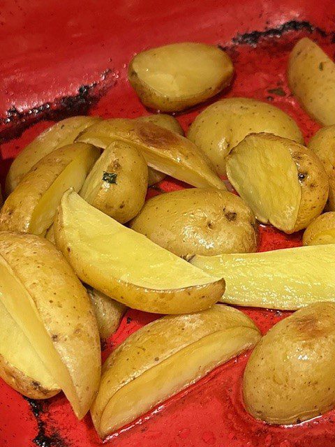 Work on the potatoes first. I used Melissa's yellow potatoes, cut in half. I roasted them at 400 degrees for thirty minutes with a healthy squeeze of lemon juice, a little water and salt. They weren't quite done when I removed them from the oven - they will finish cooking in the casserole.