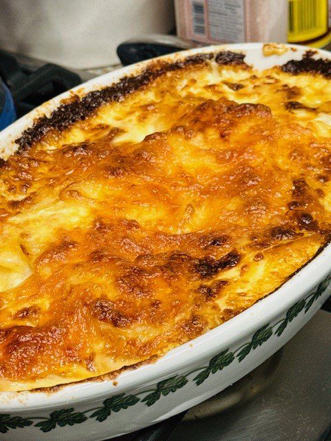 A tip about the minced fresh rosemary: Use it sparingly because it can overwhelm a dish. When I baked this at 415 degrees for an hour and 20 minutes, the skin was crisp and the meat was meltingly tender. This recipe is definitely going on the regular rotation. The Cavendar’s seasoning is key, but you could season with any combination of spices you like. And you can get the Cavendar’s on Amazon: https://amzn.to/48ZMWlT Accompanying the chicken was a casserole of potatoes au gratin, and let me just say I hit that one out of the park this time. I steeped a few big cloves of garlic in a pot of heavy cream. I steamed the sliced potatoes so that they were slightly softened before I layered them in the casserole. Be sure to salt each layer of potatoes, and sprinkle cheese over each layer also, as you assemble the dish. As usual, I took the potatoes in and out of the oven a few times as they cooked beside the chicken. When the potatoes looked like they were getting too brown around the edges, I removed the dish. Then when I thought the chicken had about thirty more minutes to go, I put the potatoes back in. That’s what happens at my house when I’m slow-watching a movie and slow-cooking dinner at the same time! And, of course, a loaf of that good Italian bread from Dorignac’s was perfect to sop up sauce. A crisp white French wine put the meal over the top. By the time Keith Richards showed up on the Jimmy Fallon show, it was a party up in here! Enjoy! Enjoy! Enjoy!