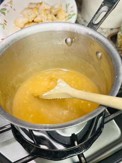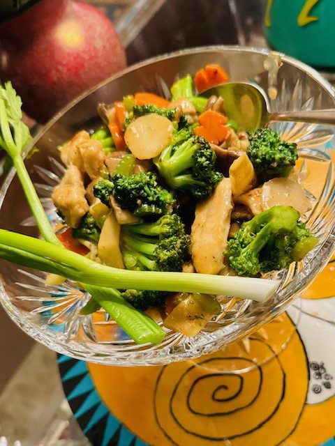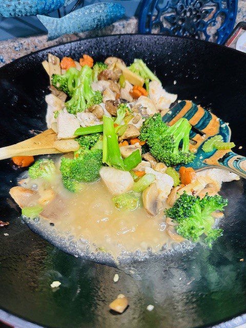 I am not calling this Moo Goo Gai Pan because there is no oyster sauce in this White Sauce. But this sauce is really good in a thick, glistening Chinese restaurant kind of way. And the dish is subject to endless variations: I did not have bok choy but that would have been delicious with the other vegetables. This is a very Americanized version of a Cantonese dish. You need to do all your prep ahead of time and when you want to eat in 10 minutes, fire up the wok and start cooking! Have your sauce thick and ready to use when you start the stry-fry. Keep in mind you may not need to use all of the cornstarch slurry. Use as much as you need to make the sauce as thick as you like.