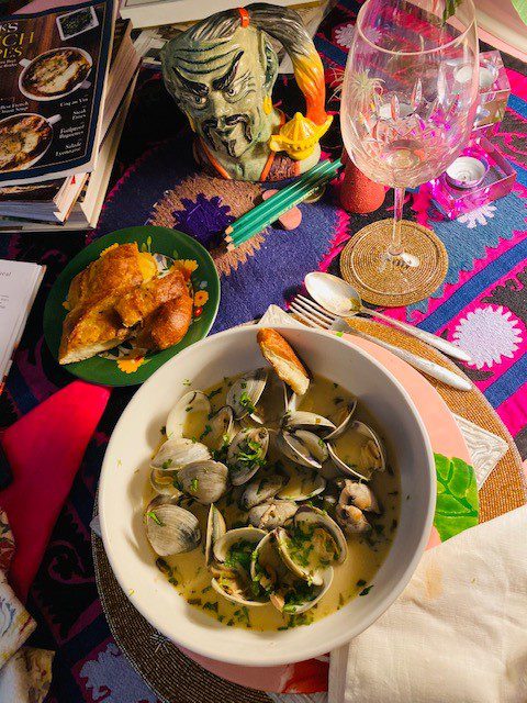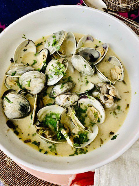 I made Tom Kha Gai soup one night and the next day, I had a big bowl of wonderful left-over Lemongrass scented Thai broth in my frig. I thought steaming mussels in that broth was a genius idea until I googled mussels in Thai broth and found out that a cazillion other people had thought of this before I did. Then I went to Whole Foods only to discover they were out of mussels but long on clams. So, I steamed these clams in my lovely Thai soup and the result was wonderful. I had a crusty baguette to sop up the broth and a glass of cold white wine to wash it down. So, maybe I’m not a culinary genius but I was pretty proud of this effort. It was fun to make and delicious, too.