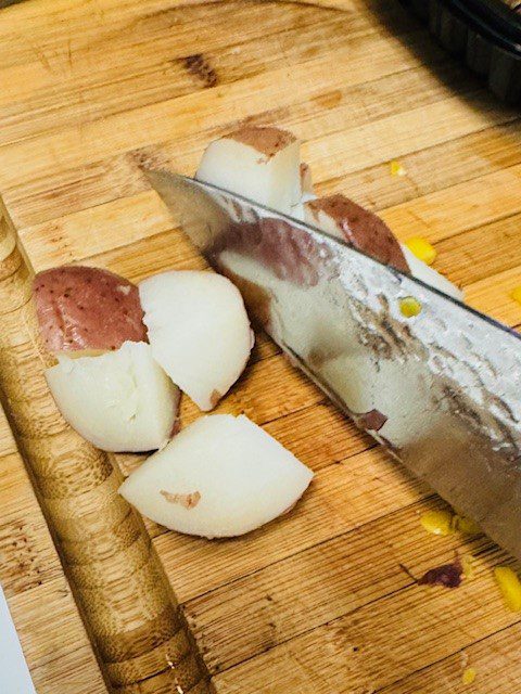 The next step of the Crawfish and Corn Bisque recipe is to add the crawfish, followed by the chopped potatoes. Next comes the seasoning.