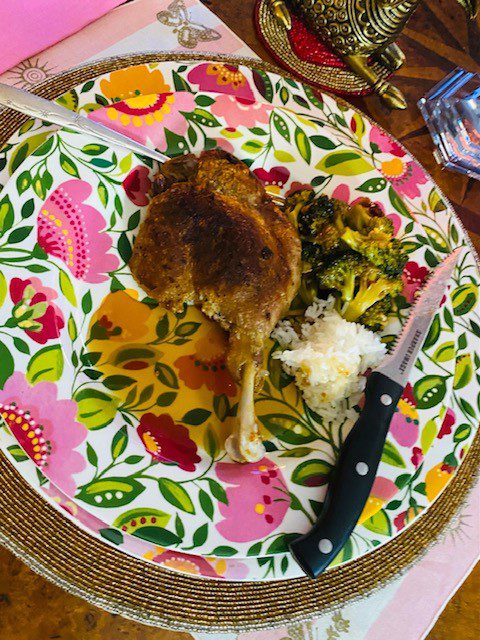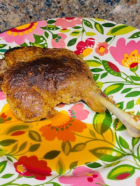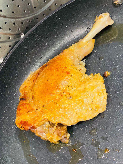 Forget Eat Pray Love. My motto is: Cure Steam Pan-fry. That’s pretty much all you need to know about how to cook these duck legs. That and that they are delicious. The duck skin gets really crispy while the flavorful meat of the duck leg remains moist and tender. When you get the almost crackly skin and the juicy meat in one bite, it’s heaven. If you cure the legs on the weekend, you can have the crispy legs during the week for an unexpectedly luxurious work-night dinner. This would be a fantastic dinner party dish with one exception: I really stood over the duck legs as they were frying because I wanted to make sure all of the skin had contact with the hot skillet and crisped up nicely. At one point, I even put a skillet on top of a duck leg and weighted it down with a heavy tomato can. You are looking for the ultimate CRISP here. That’s what makes this dish so delicious. And I’m not sure I could do that during a dinner party! I would wind up stuck in the kitchen while my guests sat at the table wondering why I disappeared. Maybe this is the perfect dish for dining solo! Or with someone who doesn’t mind standing in the kitchen with you! By the way this dish is inspired by the Chinese Crispy Salted Duck in The Woks of Life (2022) by the Leung family. I omitted the soy sauce, and I found that steaming and pan-frying times were a little longer than their recipe called for.