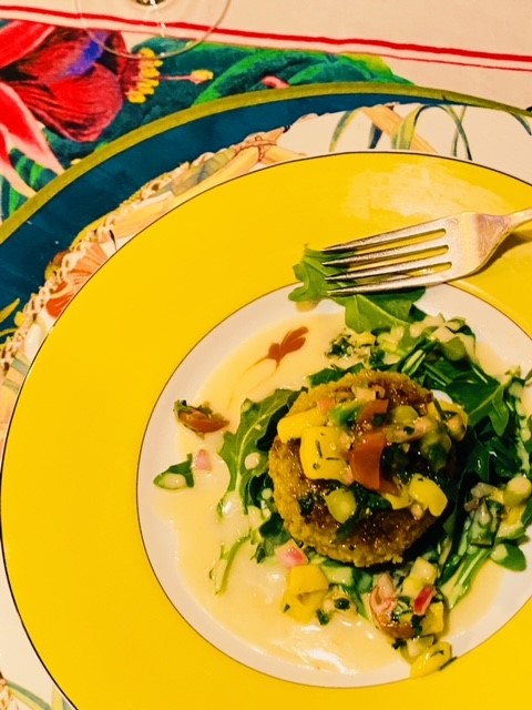 This recipe was inspired by Cindy Hutson’s curried crab cakes which I enjoyed at The Cliff Hotel in Negril, Jamaica a few years ago.  Cindy’s cookbook From the Tip of My Tongue (2015) was available for sale there and I have definitely benefitted from its guidance.  The blurb about Cindy (below) is from the Fine Cooking web site.  In addition to being a talented chef, Cindy seems like a nice person.  Her sunny personality comes through in her writing and her cooking. If you cook with love, it shows!  This dish has several components and each one should be in your repertoire.  And don’t forget the arugula on the bottom.  When you get a single bite of the peppery crunchy greens, along with the sweet curried crabmeat, the lime scented butter sauce and the lush mango salsa, you’ll see that the sum is so much more than the parts!