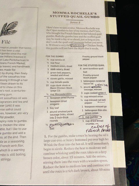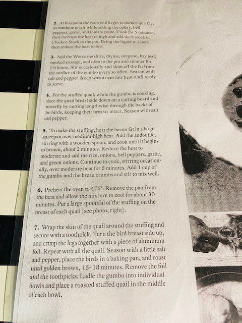 To make the stuffed quail: Saute the vegetables and mix them with the rice and bread. Add a cup or a little less of the gumbo. Stuff the quail and tie the little quail feet. Salt and pepper the birds, then roast them at 475 degrees for about 15 to 20 minutes.