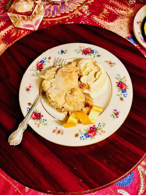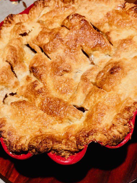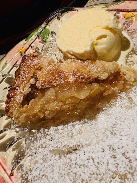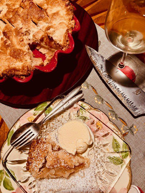 This pie filling recipe is for a double crust pie.  Find a recipe for a good pie crust and then let the dough chill in the frig for about an hour.  I made a crust in the processor using 2 1/2 cups sifted all purpose flour, 3 TBS. sugar, 1/2 cup cold shortening and 1 1/2 sticks cold butter, a little salt and 6 TBS. of cold ice water. But I’ll post that recipe elsewhere!  You can use whatever double crust pie recipe you prefer.  Just take it out of the frig a few minutes before you plan to roll it out just to let it soften a bit.  As for the apples, I used a mix of tart Granny Smith and sweet Golden delicious fruit.  The recipe says 3/4 cup of sugar and I poured a generous measurement but not quite a full cup!  Before you put the pie in the oven, brush some milk over the top and sprinkle some sugar on the pie.  This pie was better the next night when I heated it up and served it with vanilla ice cream.  The filling is sweet with just the right amount of spice (reminiscent of the filling inside a fried McDonald’s apple pie, i.e., perfect!) Note the pretty green Le Creuset pie plate! The only tedious part of making this pie is peeling all those apples — just take your time — it’s a labor of love.