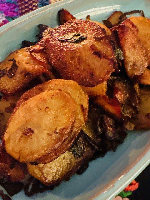 This is a no-recipe recipe in that you have to watch the potatoes and onions and bacon and adjust the heat as the components cook and brown. You want golden potatoes and caramelized onions and crispy bacon at the end. But those elements do not cook in the same period of time. Give your potatoes a head start. This is crucial because you don’t want to have black, char-tasting onions at the end of your cooking time. I used two big russet potatoes and one very large yellow onion and I think this would have been two large servings (okay, maybe four if you and your guests are being polite or shy). Really, I couldn’t stop eating them so it’s a good thing I wasn’t sharing! I used a 12 inch non-stick skillet which gave the potato medallions plenty of room to cook without overlapping each other which is important because you want to brown both sides of all the potato slices. These were soooo good with a small filet, green salad and nice red wine. My mom made these in a big black cast iron skillet when we were growing up. I don’t remember bacon in her dish but it adds a lot of flavor. This dish makes your kitchen smell great — the only trick is not burning the onions as the potatoes cook! Just give your spuds a good head start (I know, I’m repeating myself but that’s the secret) and adjust the heat beneath your skillet. It’s not rocket science – it just requires a little attention.