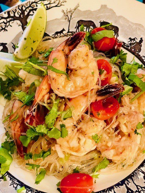 Be sure you get the right kind of noodles for this salad. Rice vermicelli noodles are different from mung bean noodles (or glass noodles). I made a trip to the Asian market to get the mung bean noodles. And, you could add ground pork to this salad, or even ground turkey. In fact, the next time I make this, I intend to cook ground turkey in a little water and add a scant teaspoon of fish sauce to it. I’ll mix that with my shrimp and garlic before tossing with the noodles and sauce. Also, I think something crunchy like chopped celery would contribute nicely to this salad. Having said all that, my Thai noodle salad was refreshing and tasty and fun to make. There are tons of recipes for this noodle salad on the internet, but this recipe was inspired by Pepper Tiegen’s recipe (Chrissy’s mom). You can even toss this salad and stick it in the frig for a while… while you open the wine and start the movie!