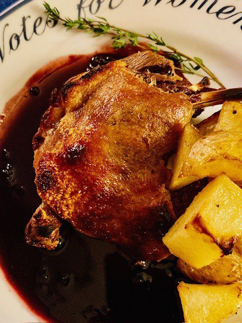 Duck confit is not hard to make but it is time consuming.  I bought frozen duck legs from D’Artagnan’s and they were delivered on dry ice.  Thaw them in the frig.  Then, cure them as directed below for at least 24 hours and up to 3 days.  Then, you have to brush or rinse off as much salt as you can and pat the duck legs dry.  Now you cook them, submerged in duck fat, for 3 hours at 250 degrees.  When the legs are cooked, remove them from the fat.  Let them cool.  Then strain the impurities from the fat and pour it back over the duck legs.  They can be stored in the frig covered in fat for weeks.  When you want to eat one, remove it from the fat carefully trying not to shred the meat.  Remove as much of the fat from the leg as you can, then broil it on high in the oven for 5 to 8 minutes.  Be careful here because the duck can easily burn.  You will wind up with deliciously crackly and crispy dark golden duck skin!  Serve your crispy duck confit with some sort of fancy-schmancy potatoes and a fruity sauce, something like this port reduction sauce, or a Cumberland sauce made with equal parts raspberry jam and horseradish.