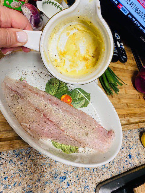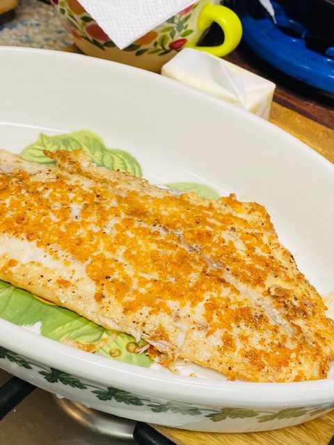 Sprinkle the fish with salt and pepper. Coat both sides of the fish with the parmesan cheese and put it in the frig to chill. The cheese will stick to the butter.