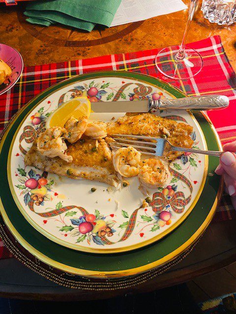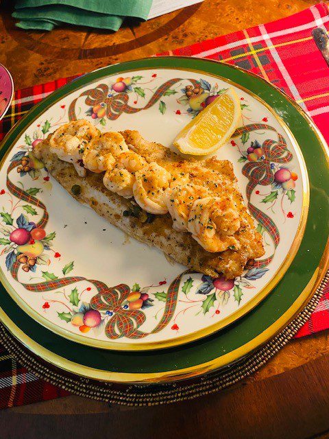 This is a really good recipe for fish.  Surprisingly, the parmesan crust does not overpower the firm white flesh of this drum filet.   And the shrimp topping is rich, luscious and lemony.  Don’t forget the capers – that salty pickle-y pop is the perfect accent.  The secret is getting the oil and butter hot in your skillet before you lay that fish filet in it.  The fish should immediately sizzle and the parmesan should turn golden and crusty within minutes.  Keep the heat high and flip the fish.  Keep the cooked filet in a low oven (250 degrees) while you cook the shrimp.  Then sit down and enjoy your evening.