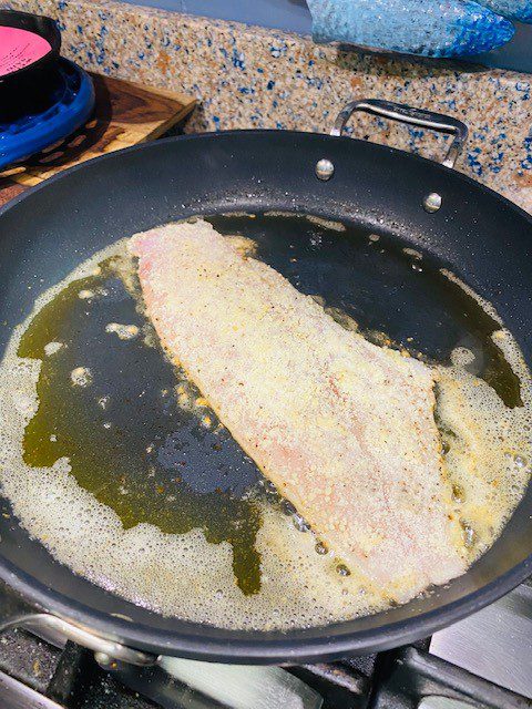 Over medium high heat, melt about 1/8 of butter in a hot skillet. Add about TBS. olive oil. When the oil and butter become very hot, almost brown, and the butter stops sizzling, lay the fish into the oil.