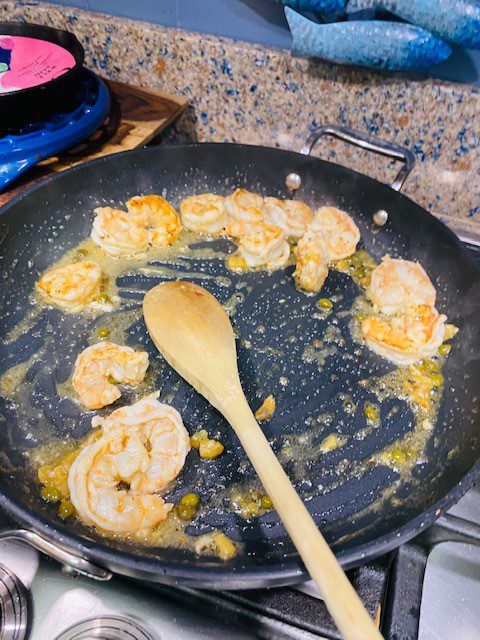 Meanwhile, remove the shrimp from their shells, de-vein, and set aside in frig. Then prepare your other ingredients. Halve the lemons. If you are using roasted garlic, mash and mince about 3 TBS. Have your capers ready.