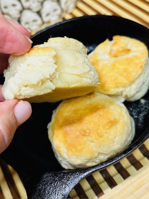 My grandmother would be proud of my biscuits.  But it took years for me to get the hang of making these simple biscuits. How many times did I watch my mom and grandmother make biscuits?  They could make these things in their sleep, scraping that wet dough off their fingers, patting the dough into a thick disc and then cutting them into rounds.  Remember to grease your pan (a black skillet is best).  And bake these in a hot oven.  Keep all your ingredients cold and don’t work the dough too much.  Use all purpose flour for your work surface and to sprinkle over the wet dough if necessary to help it come together (a.p. flour will not leave a metallic flavor on the outside of your biscuits). That’s really all you need to know.  These are delicious with hot butter and cold preserves.  Or smashed into a bowl of vegetable soup.  Or stuffed with pork chops.  Or open faced with ham and a poached egg.  You get the picture.  If you’re a Southern cook and you can’t make good biscuits you should be ashamed.