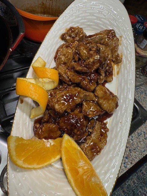 This is one of my favorite dishes to order in a Chinese restaurant. After scouring the internet for recipes, I landed on one that I thought would work. I made a few tweaks – for example, I stir fried fresh ginger and garlic as opposed to using dried seasonings in the sauce. And I marinated the sirloin beef in cornstarch, a little egg white and salt for at least an hour prior to dipping it in the batter. This was delicious! The beef was super tender and the sauce was thick, sticky & citrusy! I picked up a container of white rice at the Hot Wok in my neighborhood along with an order of egg rolls and it all added up to a beautiful Sunday night dinner while I watched Alfred Hitchcock’s, “Rebecca,” (1940), which was a perfect pre-Halloween movie! Now, why wouldn’t I just order Orange Beef from Hot Wok while I was taking out rice and egg rolls you may ask? Well, if you have to ask, you don’t get it! Making this dish at home was fun if not therapeutic. And — it really was better than any restaurant Orange Beef I have ever had. So there!