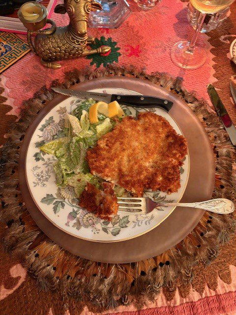 I love a good crisp Caeser salad with a lemony garlicky dressing. Add a crisp crunchy chicken cutlet and you have a light dinner that completely satisfies. This is fun to make, too. Put that chicken breast inside a gallon sized plastic bag and pound away! Try not to tear the breast but get it VERY thin. Then pan fry the cutlet in a non-stick skillet over medium high heat (heat the pan first before you add the oil). The golden bread crumbs make such a pretty dish! Pour a crisp white wine to enjoy along side this elegant plating.