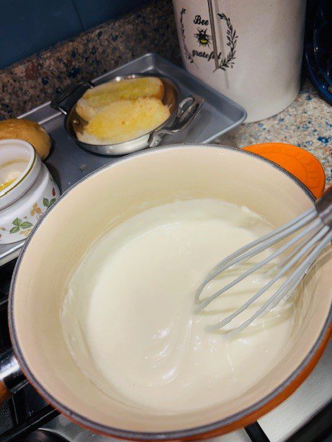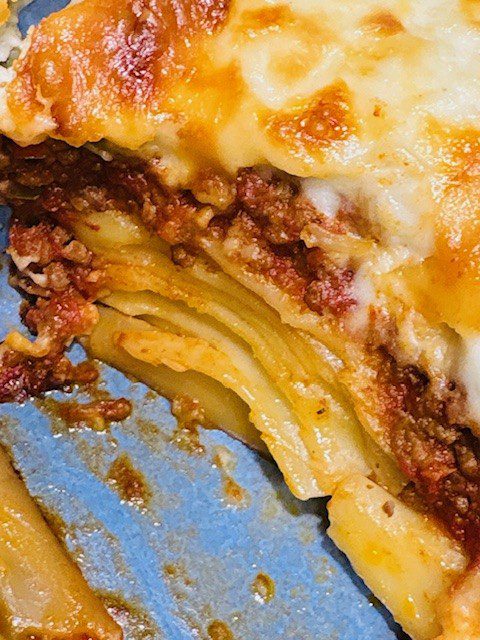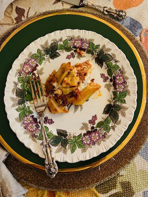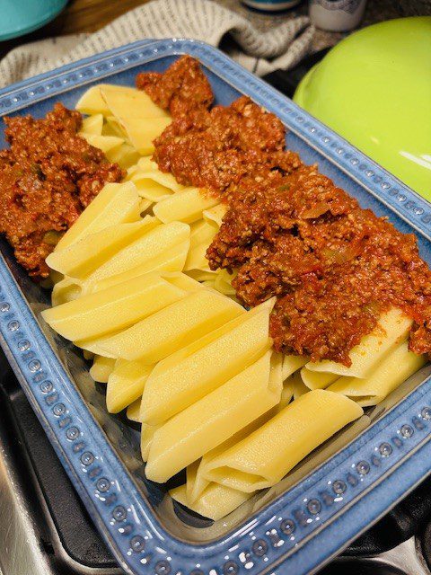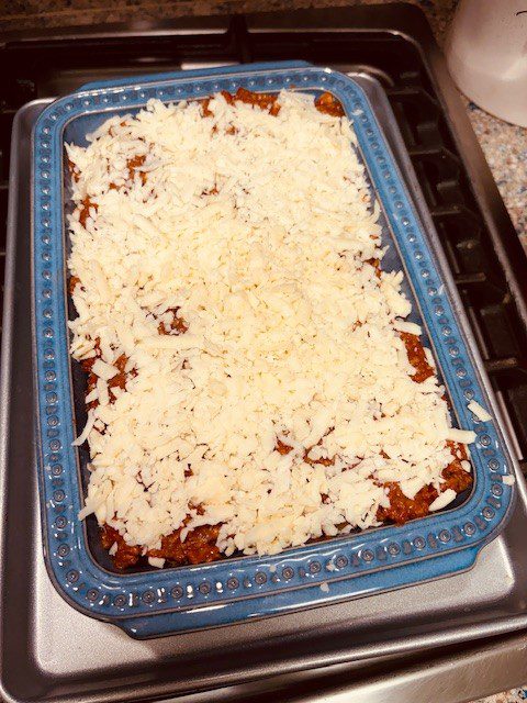 I can’t call this lasagna, and I can’t call it Greek pastitsio. I had left-over Alabama spaghetti sauce (which is an ultra-simplified Bolognese sauce) and a bag of penne pasta. I wanted to put something in the oven while I opened a bottle of red wine and talked to the dogs. So, I made a Bechamel sauce and layered the boiled pasta, the sauce, the shredded Sartori Cheddar (Smooth and Creamy in the blue package)and then the white sauce. A sprinkle of Sartori Tuscan Blend cheese went on top. I baked it at 350 degrees for about an hour and then turned up the temperature to 375 degrees to get a nice golden brown top. It was a delicious way to use my left-over spaghetti sauce.