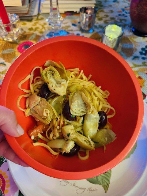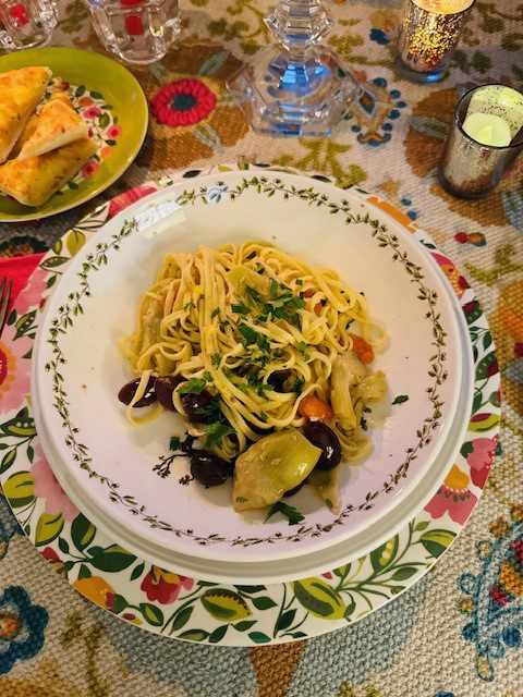 This dish is one I fell in love with at Fausto’s my favorite neighborhood restaurant.  The first time I made it, I over-thought the entire process, roasting garlic, de-fuzzing and steaming fresh artichokes, making homemade pasta, etc.  I’m not saying that I wasted my time, but the real beauty of this dish is in its simplicity.  So I tried it again.  This time, I sauteed some fresh garlic in olive oil, tossed in some canned artichokes, black Kalamata olives and cherry tomatoes, and poured in a splash of Swanson’s chicken broth.  It’s hard to beat the fresh pasta you can find now in the grocery store.  The success of this amalgamation depends on the quality of the individual ingredients.  Good salty olives, sweet cherry tomatoes and sliced canned artichokes add up to something truly divine.  Use the best olive oil you can find because you will really taste it.  Top it all off with a sprinkle of lemon zest and a shower of parsley.  This is not slow-cooking although if you must (and sometimes I must) you can prep your ingredients ahead of time, start the movie, and then toss everything in a hot skillet about 15 minutes before you intend to dine.  Give yourself a break and don’t overthink this one.