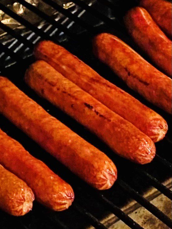 Place the weenies on the grill and close it. Lower the temp to 350 degress and cook for about 20 minutes or longer, turning every five minutes or so. Watch the dogs and cook until they are plump and have some nice dark blisters. Do not burn and do not overcook. They should be just slightly shriveled when you take them off the heat.
