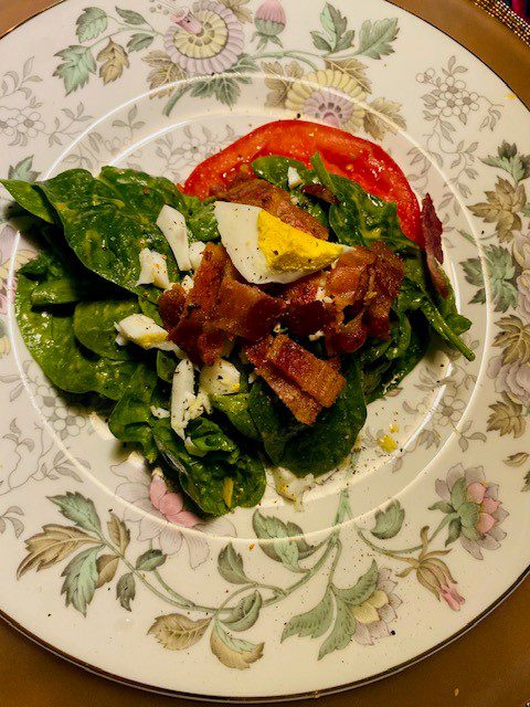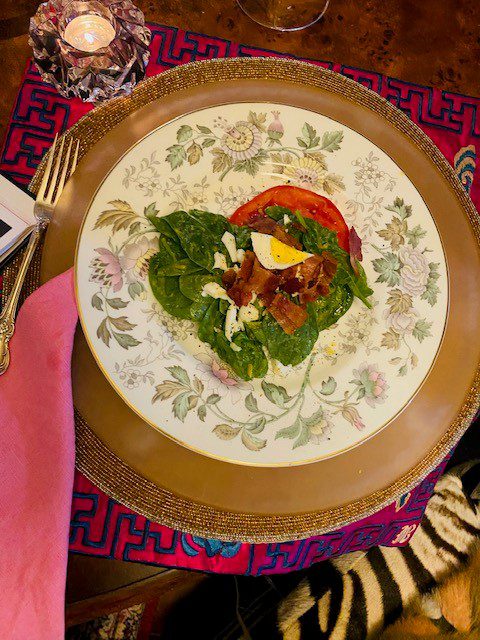 In the 1980’s there was a restaurant in Birmingham, Alabama, called The Magic Pan. As I recall it was in the Brookwood Mall. To me, when I was in my early twenties, it was such a sophisticated place to go even though it was a chain restaurant in a mall! Spinach salads were very popular back then. Often, they were served with mandarin oranges, or with mushrooms, or with tarragon scented vinaigrettes. I really don’t remember what The Magic Pan’s spinach salad was like although I do remember who used to take me there for lunch when I should have been studying but was instead playing hooky and eating crepes and salads and split pea soup. (By the way the split pea soup was delicious and when I came across a receipt for THAT, I grabbed it – see below). At any rate, it was the 1980s – so I wore Pappagallo flats, corduroy skirts embroidered with whales, and a perky ponytail. I was absolutely clueless about pretty much everything and blissfully happy. And, I have a lot of fond memories of eating spinach salads, crepes and split pea soup at the mall with a certain handsome man. The same handsome man who introduced me to German wine and Belgian chocolates. Well. So, I made this spinach salad the other night and had two big plates of it for dinner. And I thought a little bit about that particular gentleman. He had a mustache and he turned out to be a little too dangerous for a girl in knee socks. But, many years later, it’s a fun little memory. I’m going to make this split pea soup soon.