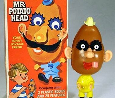 I notice that the original Mr. Potato Head had an actual plastic potato head. My mom improvised with fresh ones, along with carrots and rutabagas or whatever she had on hand to keep me occupied. I can just picture her, busy doing something else while tossing me raw vegetables to play with and to keep me quiet. I guess it worked. I loved sticking that plastic pipe into my “lovable friend,” the potato.