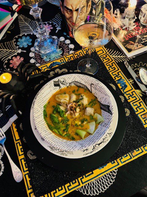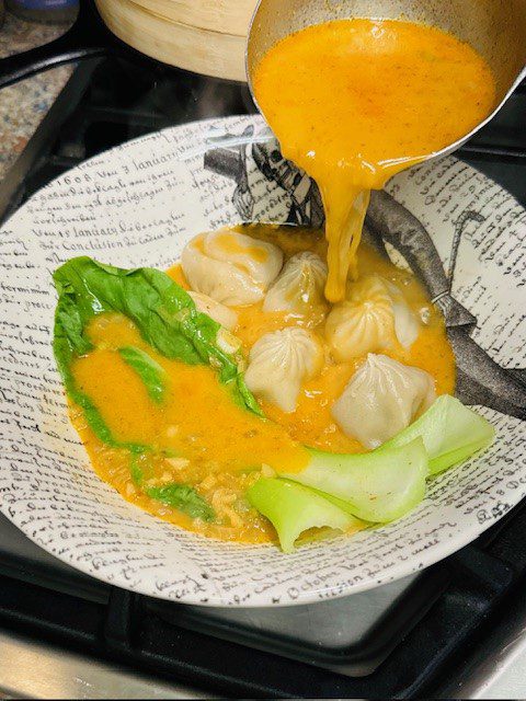 Place the bok choy and dumplings in the soup bowl, then ladle the curry soup over them.
