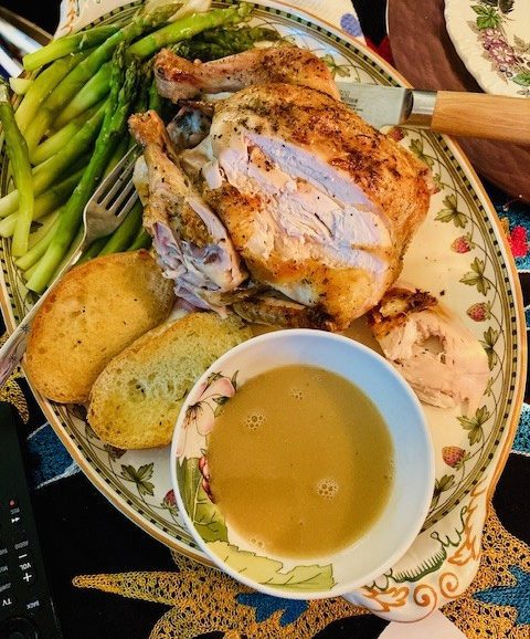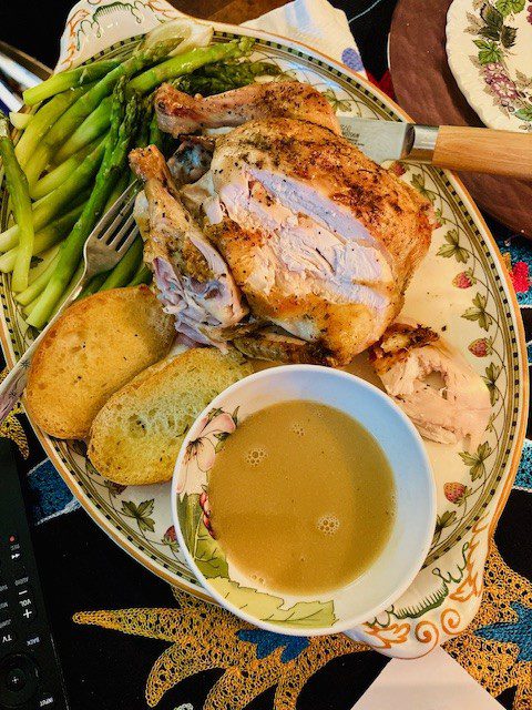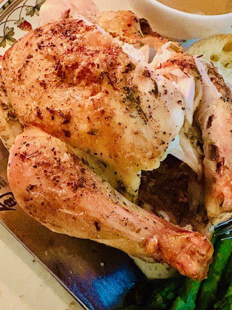 Another tip: DRY the chicken before you salt, pepper and butter it. Don’t put an ice cold chicken in the oven. Use dried tarragon for the basting butter but tuck some fresh tarragon sprigs around the chicken while it is roasting.