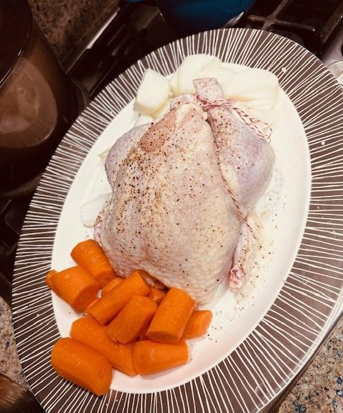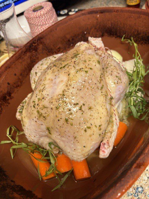 Layer the chopped onions and carrots on the bottom of the clay pot. Put the chicken on top of the vegetables. Pour the butter mixture over the chicken (this is the melted butter with dried tarragon, salt and pepper). Pour the chicken stock around the chicken but NOT ON TOP of the chicken. Nestle a few sprigs of fresh tarragon around the chicken.