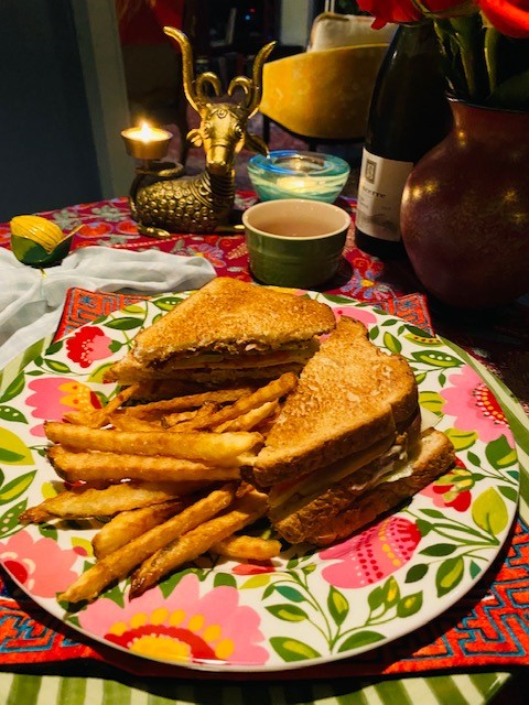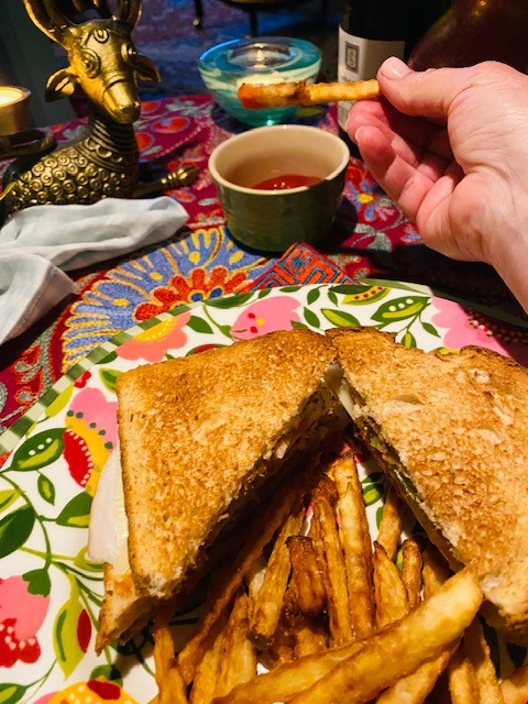 A club sandwich may be one of the ultimate comfort foods for me. It reminds me of ROOM SERVICE and CASINO dinners (the latter reference being a somewhat blurry memory of eating club sandwiches in the middle of the night in Las Vegas). The rules are simple: turkey, bacon, lettuce and tomato on good toasted bread with a healthy slathering of mayo. If you’re making crinkle fries to go with the sandwich, you can do the first fry and let the potatoes rest while you slice tomatoes and fry bacon. Bring your oil up to temp before you toast the bread. Then as the bread is toasting, toss the fries in the hot oil for a second fry. On this particular SWELTERING Saturday New Orleans night, a cold bottle of Sancerre was the perfect accompaniment. This is BETTER than room service (well, okay, room service at a swanky hotel is hard to beat). Screen a good movie. Talk to your dogs. Go on vacation in your own living room and celebrate your life.