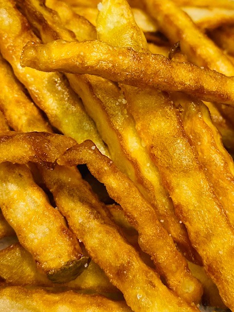If you are timing the fries to be done when the sandwich is ready, cut your potatoes into fries and soak them in ice water for at least an hour. Then dry them very well and give them the first fry in 340 degrees oil. When they are tender (about 3 minutes), place them on some paper towels. They can hold another hour or so. The second fry will be at 365 degrees at least (the oil will lose heat when you toss in the fries). They're ready when they are crispy and golden. WATCH YOUR HOT OIL - BE VIGILANT - HOT OIL IS DANGEROUS.