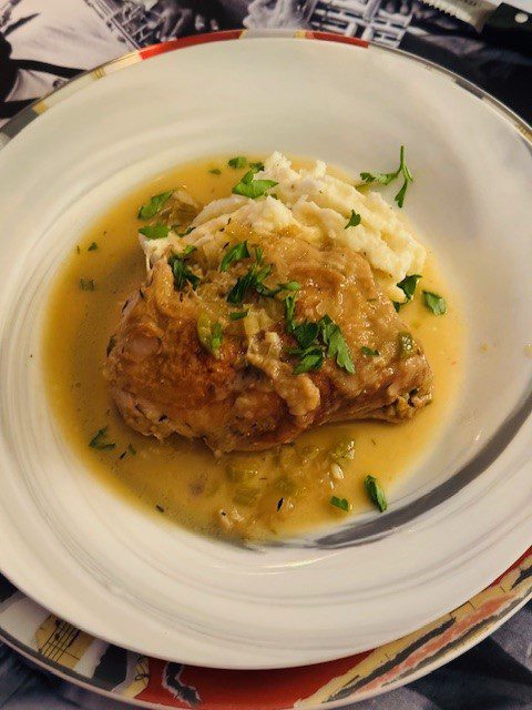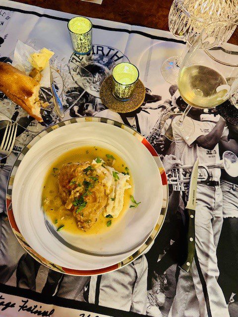 This recipe is inspired by a true uptown doyenne from a by-gone era. Mrs. Williams was my (deceased) husband’s mother who from all accounts ruled her home like a gracious five star general (which I recognize is a contradiction in terms). There were formal dinners, strict rules of etiquette and lots of polished silver. Her portrait hung in our home: she strongly resembled Mrs. Drysdale from the Beverly Hillbillies and I suspect her personality was similarly austere and haughty. Somehow I wound up with a packet of her handwritten recipes which reveal much about her life and household. Many of her recipes start with instructions for Mrs. Lucas the servant to cut up a chicken. One of my favorite memories is of my husband Frank, without a hint of irony, telling friends at dinner that, “World War II was tough on my mother… all of her servants got drafted!” Deciphering Mrs. Williams’ fancy cursive writing is a challenge, but I finally figured out that she called this chicken recipe Chicken Madison. I have no idea why unless she got the receipt from Mrs. James Madison (just kidding). But I love it that she planned her menu around drinking cocktails with guests! I’m sure her servants were in the kitchen keeping an eye on things. What a different time. As I have said before, written recipes are really stories. When I made this dish, I was puttering around the house with a glass of wine in my hand while I watched the gorgeous Dev Patel in “Monkey Man” (2024). This is the kind of dish that gives you time to do your own thing and enjoy the evening (if that means having cocktails with your guests, great!) But sure to serve this over creamy potatoes or rice or pasta with crusty bread to sop up the beautiful sauce. Cheers to Mrs. Williams… and to Mrs. Lucas too.