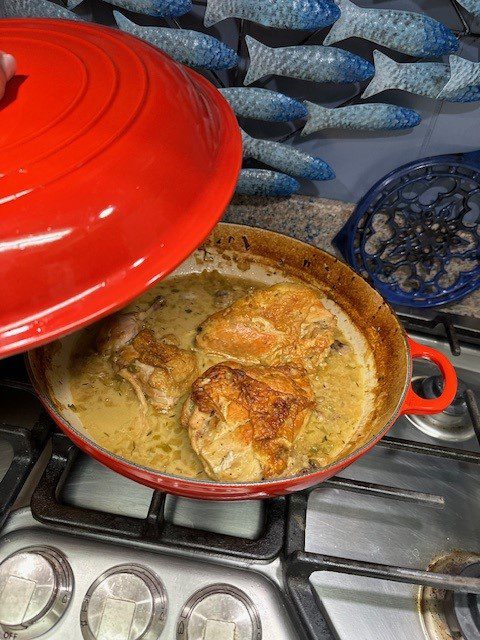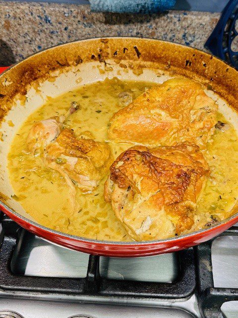 Take the Dutch oven out of the oven and remove the chicken pieces and place them on a platter. Reduce the sauce if necessary over medium heat on the stove top. When you have the sauce the consistency you want, and you have seasoned it to your taste buds, return the chicken and let heat through.
