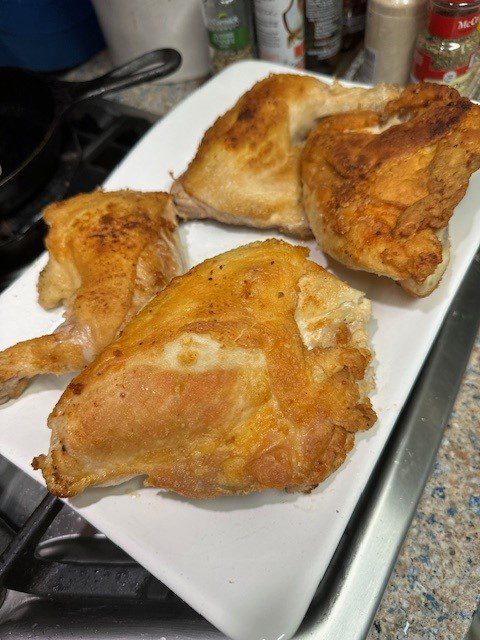 Put the chicken back in the pot, skin side up. Cover and put the Dutch oven in a 325 degrees to 350 degrees oven. Cook for up to 3 hours, checking every so often to make sure there is enough liquid and that the chicken is mostly submerged. Cook until the chicken is tender. This will take longer at 325 degrees, obviously, so you have to adjust your cooking time to the temperature of your oven. I like to cook the chicken until it is falling off the bone.