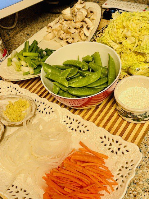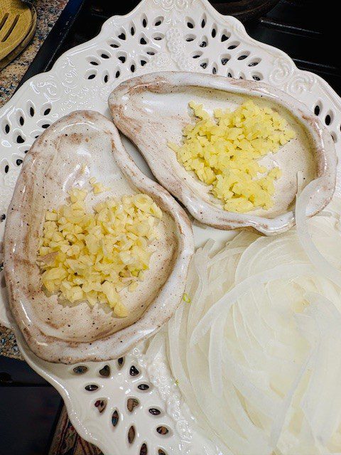 I make this dish frequently but usually I add chicken or shrimp.  When I got home from Dorignac’s yesterday, I realized I had not picked up either.  I’m going to blame my forgetfulness on stress — this was not the first time I went to the grocery store and forgot to pick up what I went for.  Oh, well, I would just have to be a vegetarian for the night.  Well, dinner was delicious.  I love these crispy noodles, fresh vegetables and Cantonese “gravy.”  No matter how many times I make this sauce, I still have to taste, test and tweak to get the right amount of sugar versus soy, so you should do the same.  If you are a little stressed, all that chopping and mincing is therapeutic.  And note that my ceramic oyster shells make perfect prep bowls for my mise en place.  This is my idea of comfort food elevated.