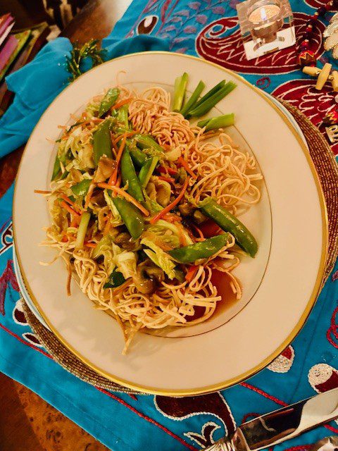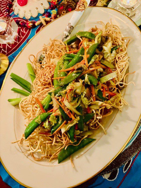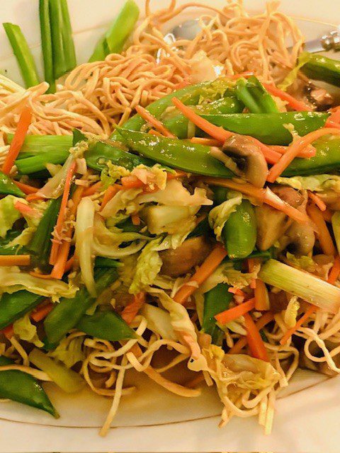 When the vegetables are almost cooked but NOT over cooked or wilted, add the sauce. It will bubble up. Let it thicken a bit. Add the cornstarch slurry and stir. Turn down the heat and serve over the crispy noodles.